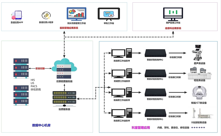 控費(fèi)系統(tǒng)通過(guò)與his和pacs對(duì)接,和設(shè)備對(duì)接,患者做檢查,醫(yī)生在pacs里面正常做登記,登記之后,控費(fèi)系統(tǒng)自動(dòng)讀取這些信息,能精準(zhǔn)的識(shí)別哪個(gè)患者在做檢查,在做什么檢查項(xiàng)目都可以識(shí)別到。